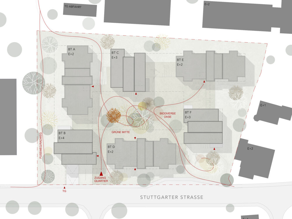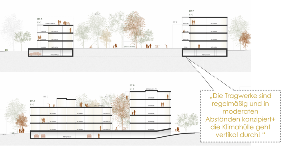 Altes durch Neues ersetzen ist die Devise der Wohnbebauung in Kufstein. Asphalt, gepflasterte Aussenbereiche und abgewohnte alte Arbeiterwohnungen sind bald Schnee von gestern und es wird richtig grün:.In drei möglichen Bauetappen kann situationselastisch die bestehende Wohnsiedlung in die Zukunft geführt werden.  Zwei Hausfamilien – eine strichförmige Bebauung und ein Punktgebäudetypus schaffen in einem Gesamtensemble von 6 Häusern ein autofreies Quartier um eine neue grüne Parklandschaft. Es grünt so grün – und das nicht nur in Spanien!