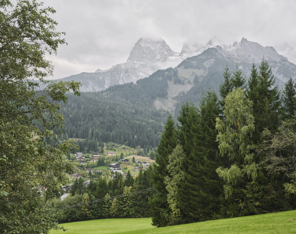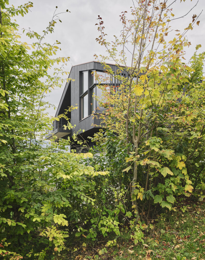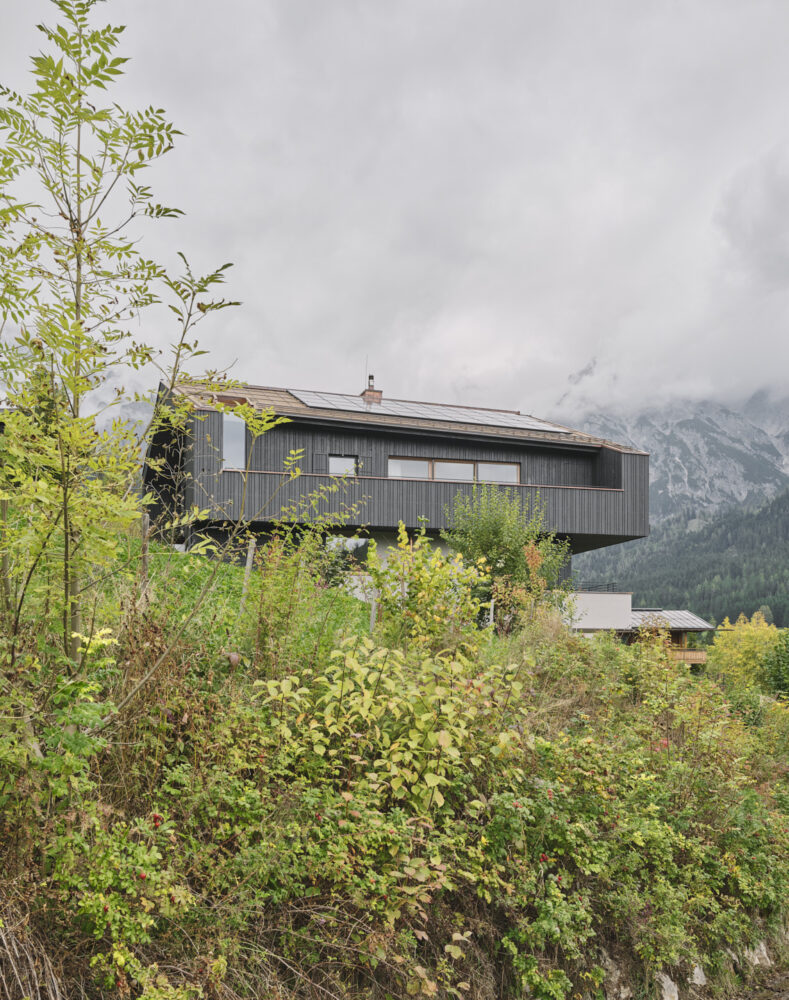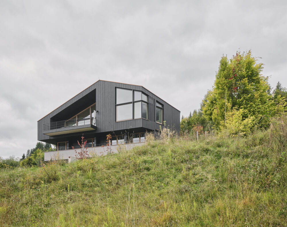 Ein Haus patzierte sich auf einem Grundstück wie nach einem Sprung vom 5 Meter Turm mit Bauchflecklandung – flach und breit. Intensive Umplanungen in Salami-Taktik – immer ein Scheibchen mehr abschneiden, ein bald verbrauchter  Radiergummi und eine oft betätigte Delete-Taste entfernten letztendlich alles bis auf die Grundmauern. Ein neues Haus ragt nun schlank und aufrecht aus der Landschaft.  Dem steilen Hang empor schlichten sich in sanfter Drehung vier Ebenen, ähnlich einer Himmelsleiter wird das Haus durchschritten und oben angekommen ist man bei Schlechtwetter direkt in den Wolken. Das Einfügen der Geschosse in die Hanglandschaft,  Drehungen zum Einfangen der imposanten Berg- und Talblicke und Zutritte zu feinen Aussenplätzen dem Verlauf der Sonne folgend zu schaffen, endeten in einem in Sichtbeton gebauten SALTO MORTALE!  Unsere Gehirnwindungen  wurden jedenfalls ständig durch selbst auferlegte Perfektion in aktrobatische Sphären gebracht!